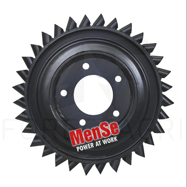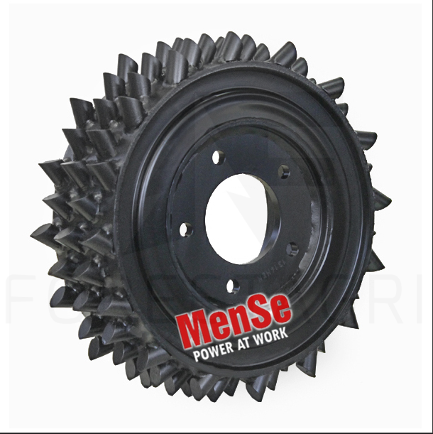 Wulkanizowane koła gumowe redukują hałas i drgania w kabinie kombajnu, tłumiąc wibracje i zwiększając komfort operatora. Pozytywne efekty amortyzacji gumowej są szczególnie widoczne podczas pracy z twardymi gatunkami drewna. Tłumienie drgań zwiększa precyzję chwytu i poprawia trakcję. Asymetryczne kolce wykonane z odpornej na zużycie stali zapewniają maksymalną przyczepność podczas podawania pnia drewna.