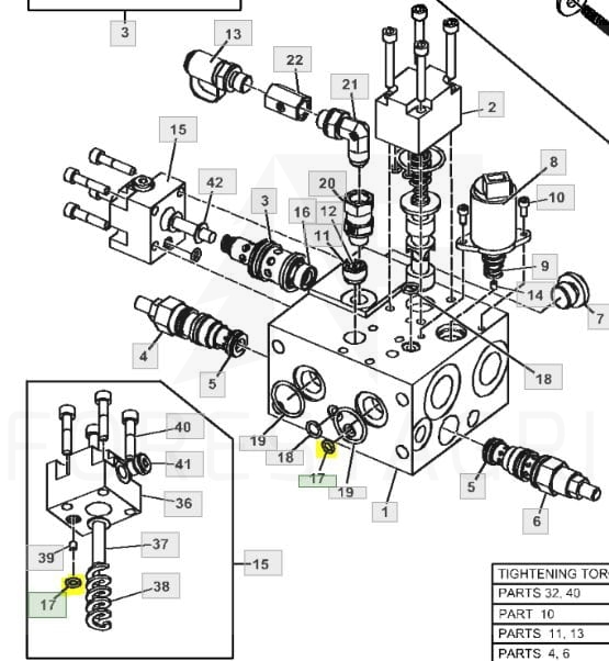 The O-ring F008448 is characterized by high resistance to pressure and extreme working conditions. It is used both in hydraulic pumps and the valve block of harvester heads, providing long-lasting and secure sealing. The position of the O-ring can be seen in the attached photos, making it easier to install correctly.