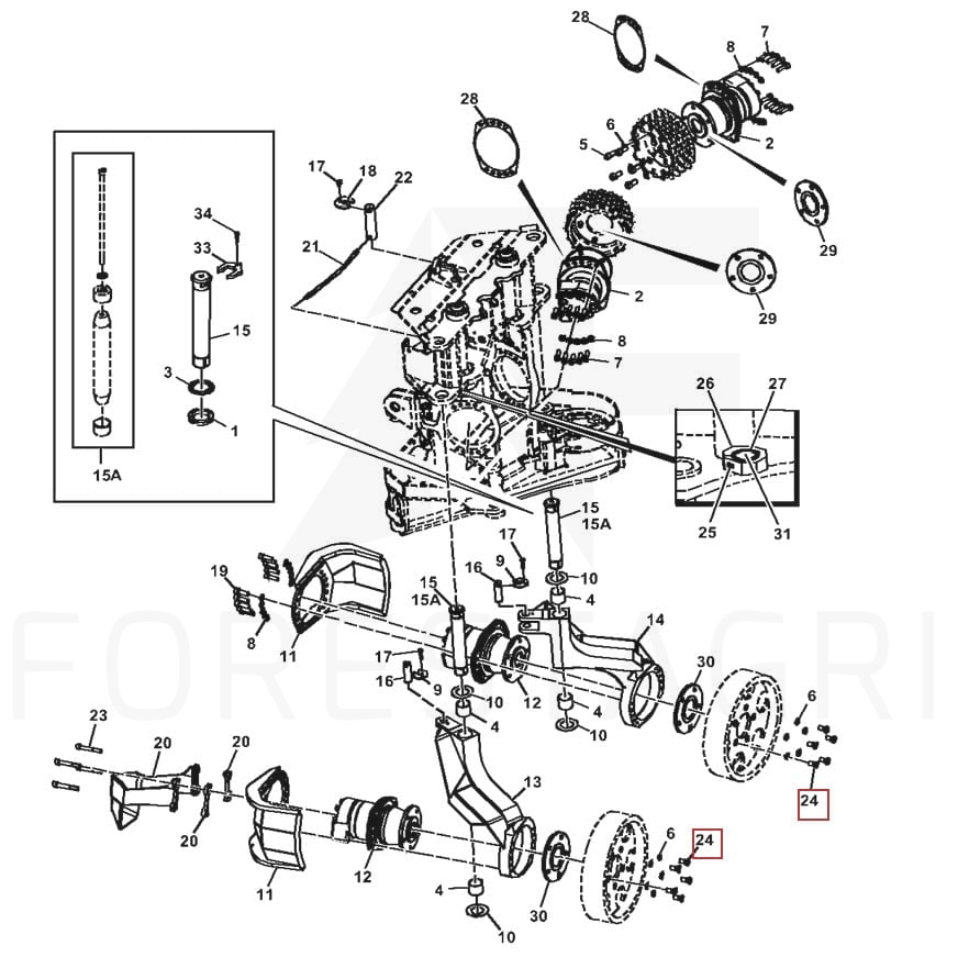 Mounting screw for feed rollers in harvester head engines.